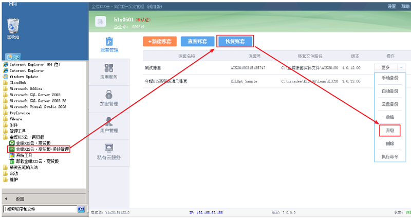  具体操作路径:在金蝶KIS私有云服务器上,通过【开始】→【所有程序】→【金蝶KIS云·商贸版】→【金蝶KIS云·商贸版-系统管理】→【账套管理】界面,使用【恢复账套】功能,恢复低版本的账套,点击该账套的【更多】→【升级】。