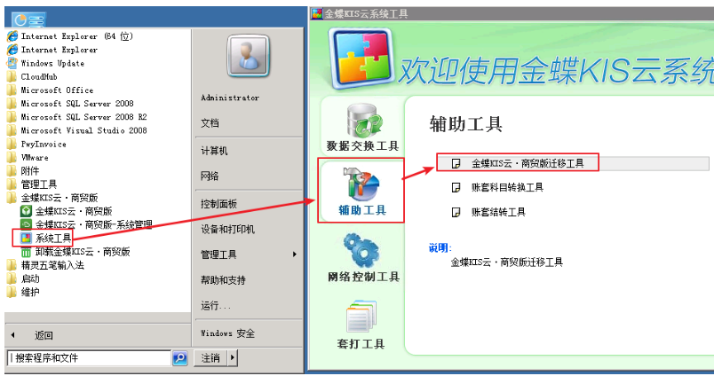 具体操作:通过 【开始】→【所有程序】→【金蝶KIS云·商贸版】→【系统工具】→【辅助工具】→【金蝶KIS云·商贸版迁移工具】。