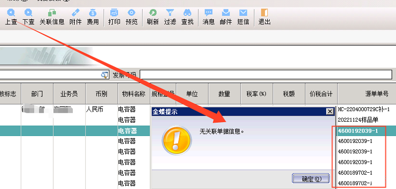 购货发票每一行都有源单单号和源单类型,但是有部分行上查无关联单据,部分行上查可以查到单据