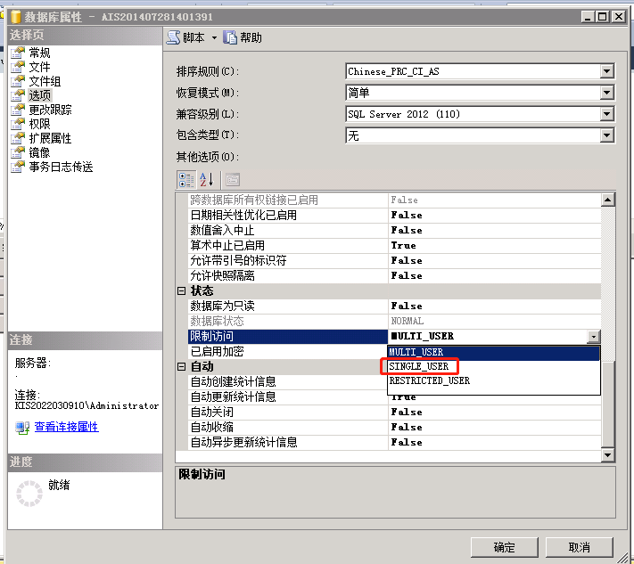 1、先将所有客户端关闭,关闭后打开数据库,在数据库中将数据库设置为单用户模式,具体路径是选中有问题的数据库,右键-属性-选项-限制访问,将MULTI_USER改成SINGLE_USER。