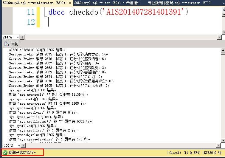 2、修改后,执行语句dbcc checkdb('数据库名'),如dbcc checkdb('AIS201407281201391'),检测数据库损坏程度。看右下角的执行情况分析数据库损坏程度,损坏程度如下: