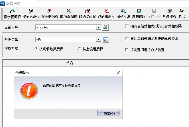 莱西金蝶软件_KIS旗舰版进行部门数据授权提示:选择的数据不支持数据授权!