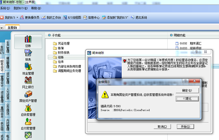 子模块勾选了与总账模块连用,那么总账结账时会检测子系统是否已经结账,并且在子系统未结账时总账不允许结账。