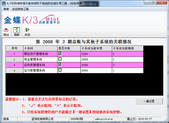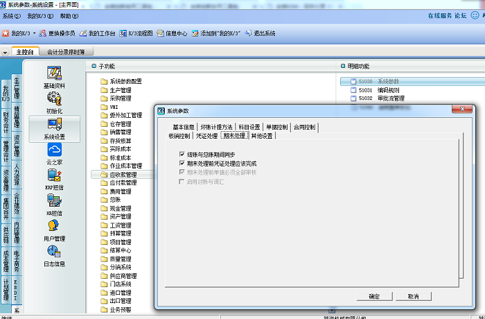 2、不需要控制子系统早于总账结账,可取消子系统的参数控制,然后再进行总账结账即可;或者使用工具[K/3总账结账提示有未结账子系统的快速处理工具]快速取消子系统的参数控制;(PS.不建议子系统晚于总账结账)