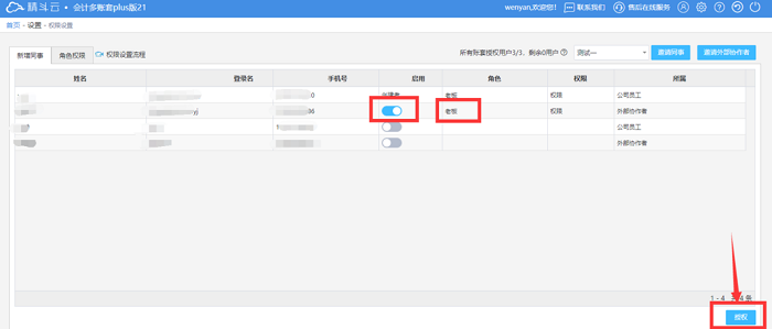 2、将需要授权的用户点击[启用]按钮,并选择具体[角色],点击右下角的[授权]即可