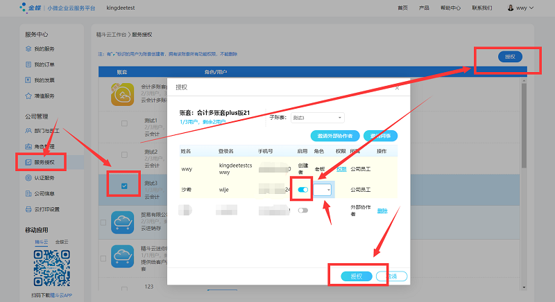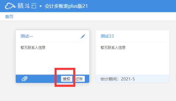1、登录系统后进入到账套列表界面,选择需要授权的账套点击[授权]按钮