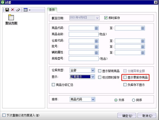 单击[仓存管理]-[即时库存查询],在[过滤]界面勾选“显示零库存商品”即可。