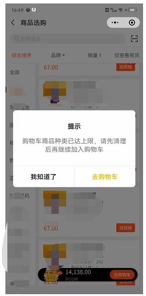 购物车最多加99个商品,当超过99个商品,就会提示购物车商品种类已达上限,请先清理后再继续加入购物车。