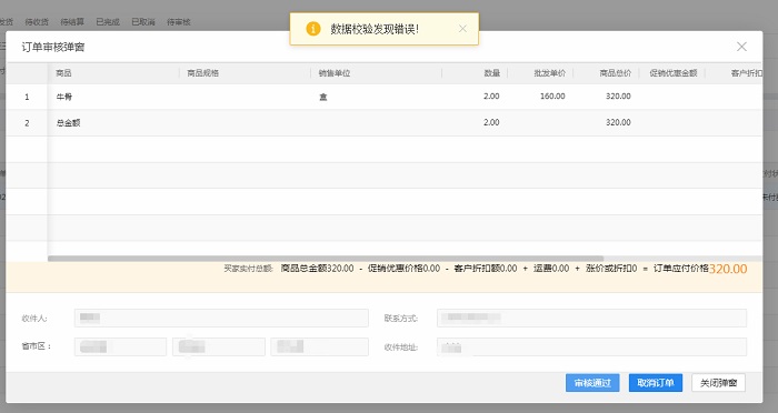 订货订单审核出现数据校验错误提示一般有以下情况: