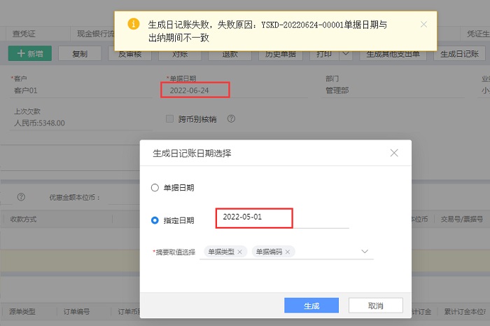 举例:2022年6月24号的预收款款只能生成再2022年6月任何一个时间的日记账,其他期间不可以,比如选择5月份,日记账是无法生成的