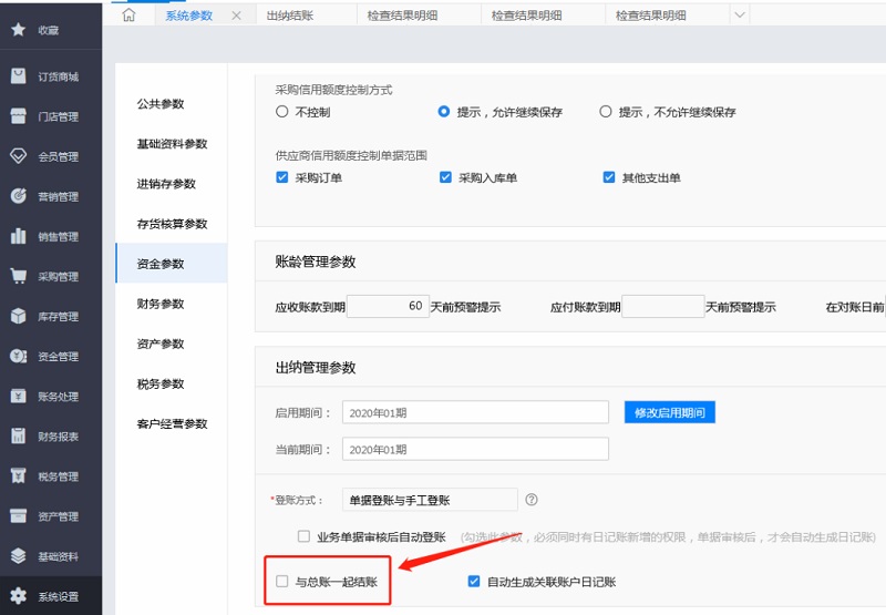出纳模块可以设置单独结账或是和总账一起结账。可以在[系统参数]-[资金参数],可以勾选或是取消勾选[与总账一起结账]。如果勾选了,出纳模块无需单独结账,在[账务处理]-[期末处理]-[结账],总账操作结账即可同时结账出纳模块。