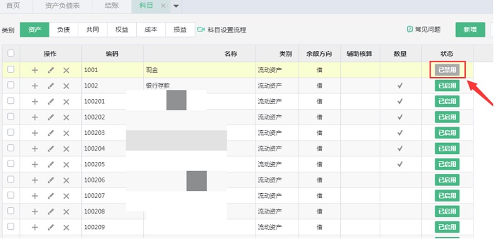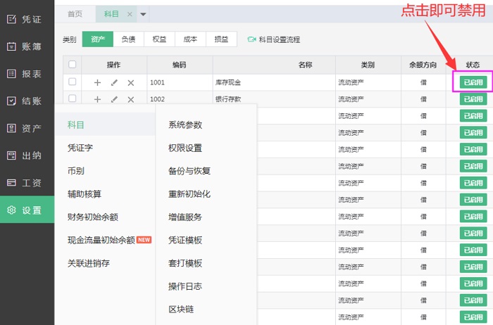 1、【设置】-【科目】,在科目页面,点击科目后面的“已启用”,禁用该科目