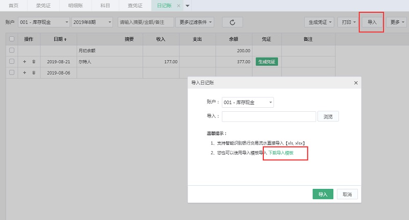 3、在下载的导入模板中录入日记账数据,再回到系统中点导入即可。