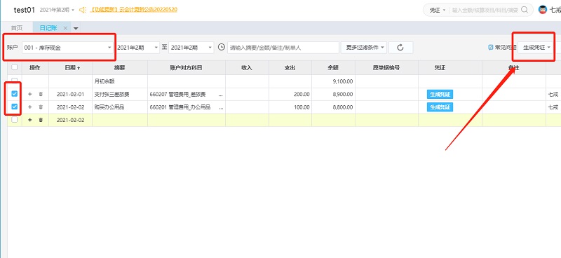 进入日记账界面,选择好对应的账户,期间,勾选需要生成凭证的日记账分录,点击右上角【生成凭证】即可;