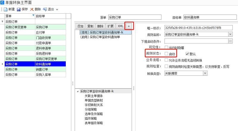 1、打开BOS通版转换规则,扩展转换规则,并停用转换规则。此时可以在规则列表右上角看到一个+号。点击后此规则中会添加排序策略。(如果停用转换后,没有出现加好,可以鼠标点击其他规则,此时可以看到+号)