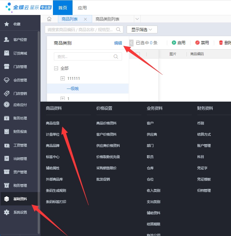 1、点开【基础资料】-【商品信息】-点击左侧商品类别栏编辑