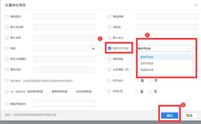 在批量修改商品页面,勾选成本计算方法,选择需修改的计价方法后,点击确定即可