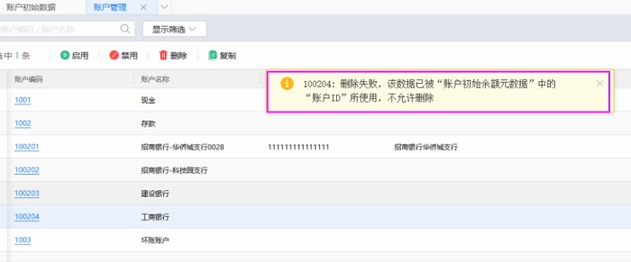 如“工商银行”账户期初余额仅删除数值,账户余额仍是被占用,需要把整行记录完全删除后,才可能成功删除账户。