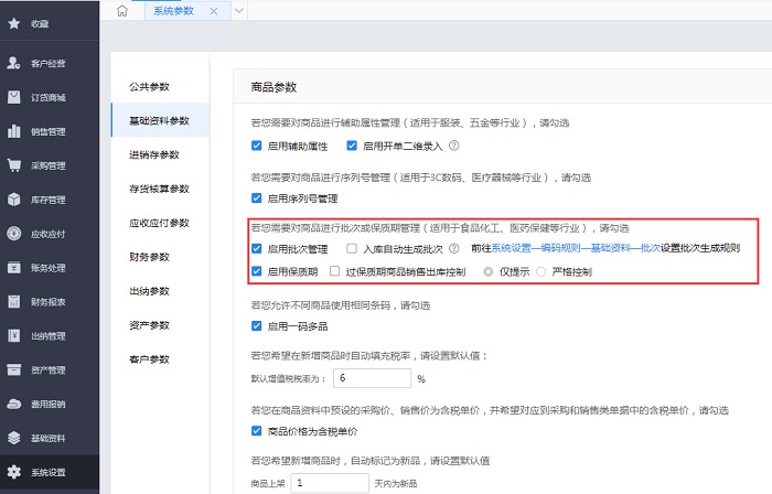1、在系统设置-系统参数-商品参数中,勾选“启用批次管理”“启用保质期”