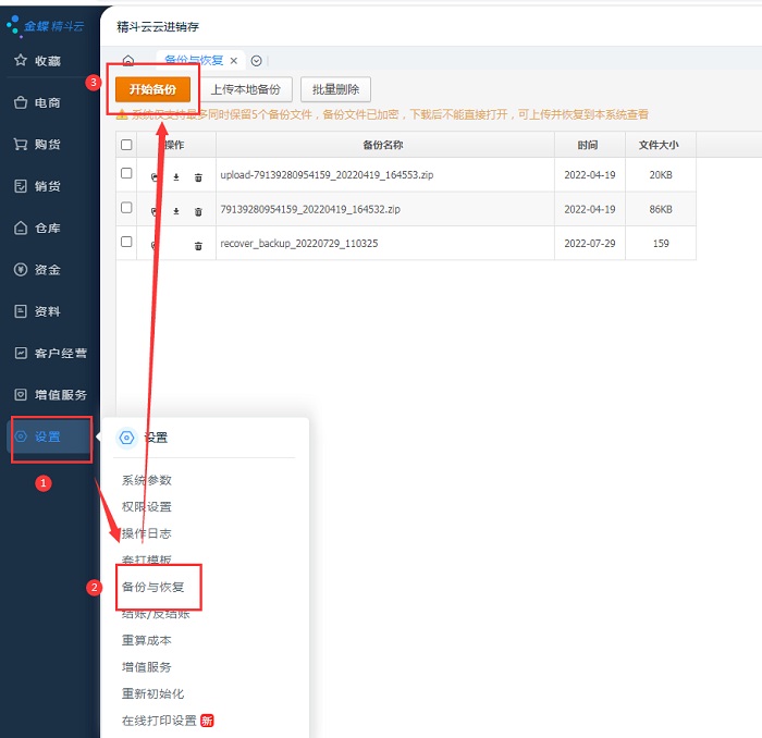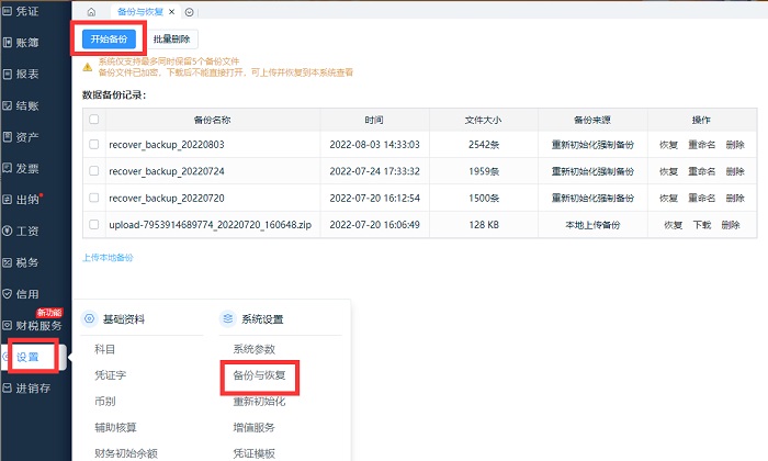 使用账套系统管理员账号,在【设置】-【备份与恢复】中点【开始备份】,可以将当前账套备份完成。
