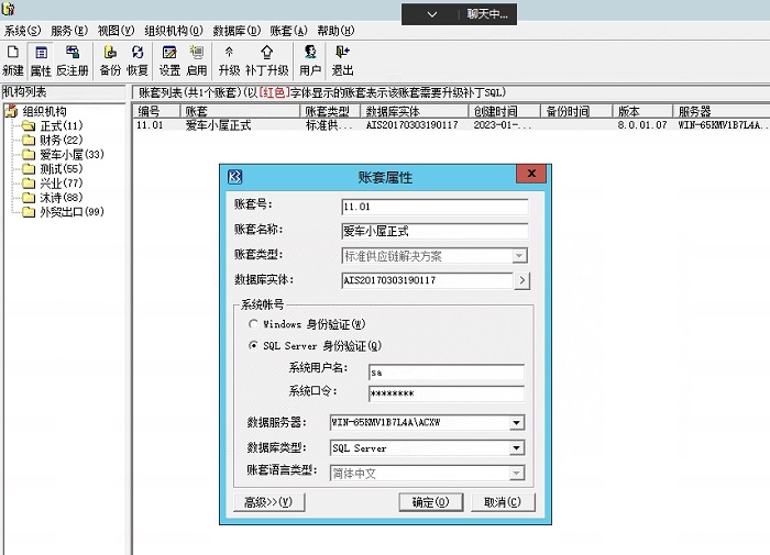 解决方案:打开账套管理--点击异常账套--点击左上角的属性,检查配置的身份是不是SQL server身份认证,是不是没有填写sa的密码。