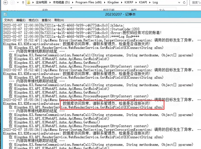 检查api日志可以看到如下内容:数据库访问异常,请联系管理员...