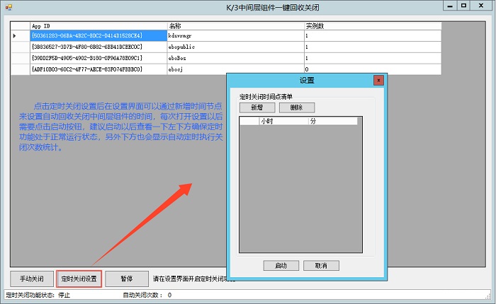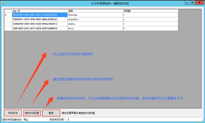 此工具可以实现一键关闭K/3 WISE中间层组件,也支持设置时间节点自动回收关闭中间层组件。有需要可以进行下载,注意工具需要管理员权限打开使用,