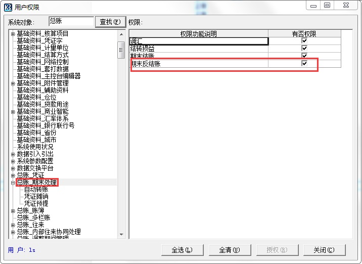 5、左边选中[总账_期末处理],勾选[期末反结账],单击[授权],关闭即可。