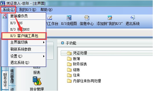 2、依次单击[系统]→[K/3 客户端工具包]即可打开。