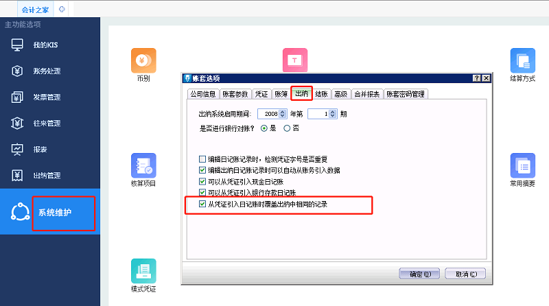 【操作步骤】 1、登陆软件主界面,依次点击【系统维护】-【账套选项】-【出纳】-【从凭证引入银行日记账时覆盖出纳中相同的记录】打勾;
