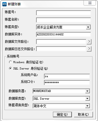 账套在SQL Server数据库服务器中的唯一标识。 新建账套时,系统会自动产生一个数据实体,也可以手工更改。