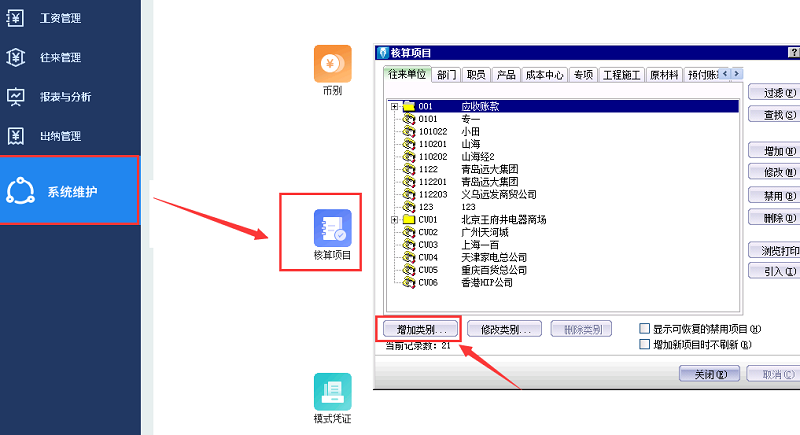 2、鼠标左键单击核算项目页签左下角的【增加类别】进入【核算项目类别】页签;