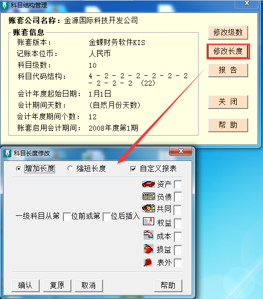 单击电脑左下角[开始]-[金蝶KIS]文件夹-[工具]文件夹,选择[科目结构管理工具],选择对应账套登录,[修改长度]内可针对一级科目增加或缩短长度。