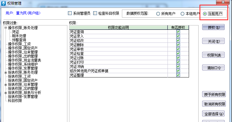 使用manager登录账套单击[系统维护]-[用户管理]双击此用户进入[权限管理]界面,“数据授权范围”选择为“当前用户”。