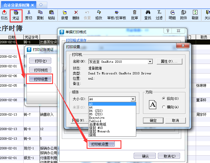 4、打开金蝶 KIS,在会计分录序时簿界面,单击[凭证]—[打印设置]—[打印机设置],纸张大小选择新增的格式名称即可。