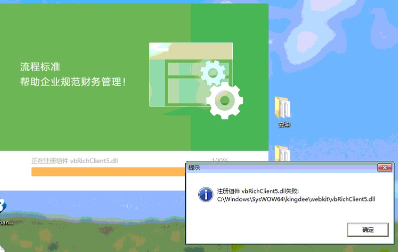 在安装KIS云产品时,提示:注册组件 vbRichClient5.dll失败: