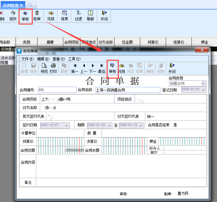 2、单击选中需要反审核的合同,单击工具栏中[审核]按钮,打开[合同]窗口;