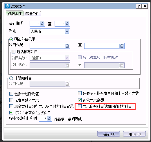 打开[账务处理]—[明细分类账],在过滤条件界面勾选参数“显示所有明细账的对方科目”。