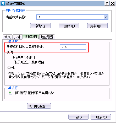 3、单击[核算项目],在[多核算科目项目名排列顺序]中输入1234。