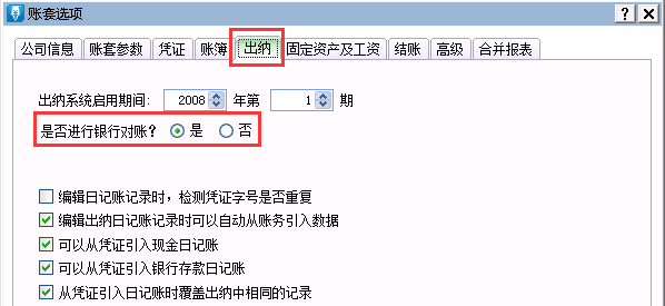 2、没有使用出纳管理模块,点击[系统维护]-[账套选项]-[出纳],将[是否进行银行对账]选择为[否];