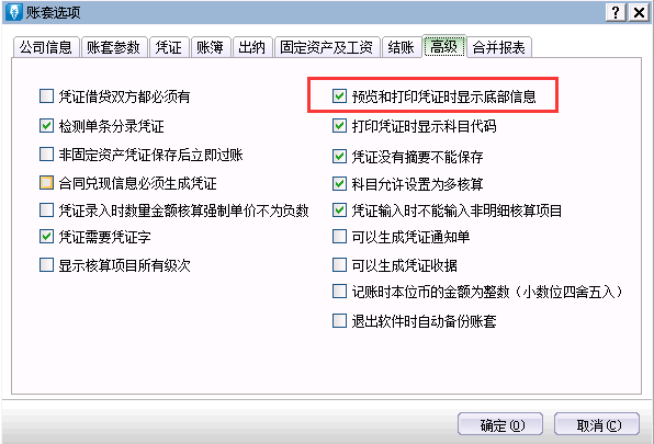 单击[系统维护]-[账套选项]-[高级]-勾选[预览和打印凭证时显示底部信息]参数。