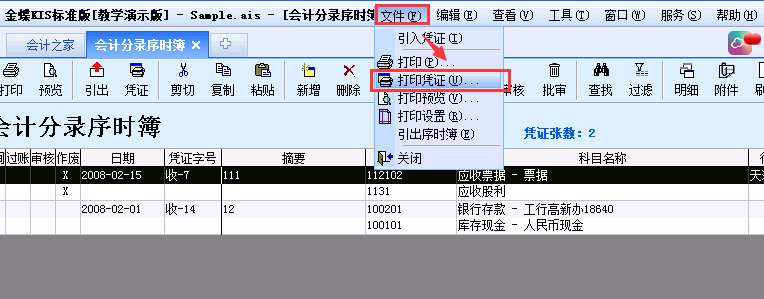 会计分录序时簿页面-点击[文件]-[打印凭证]-[打印设置]-[常规]-[凭证汇总]选择[不汇总]。