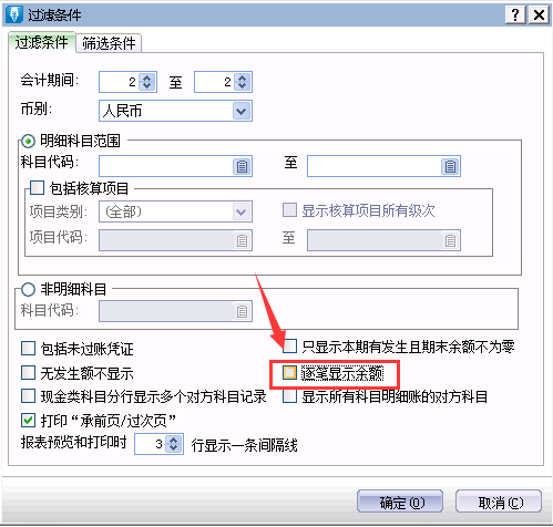 2、取消勾选“逐笔显示余额”,单击[确定]完成设置。