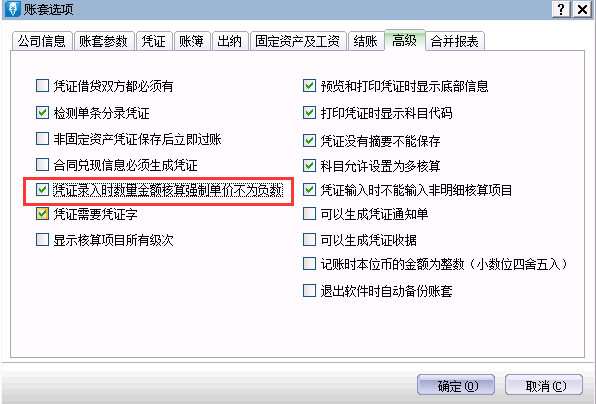 2、勾选参数“凭证录入时数量金额核算强制单价不为负数”。