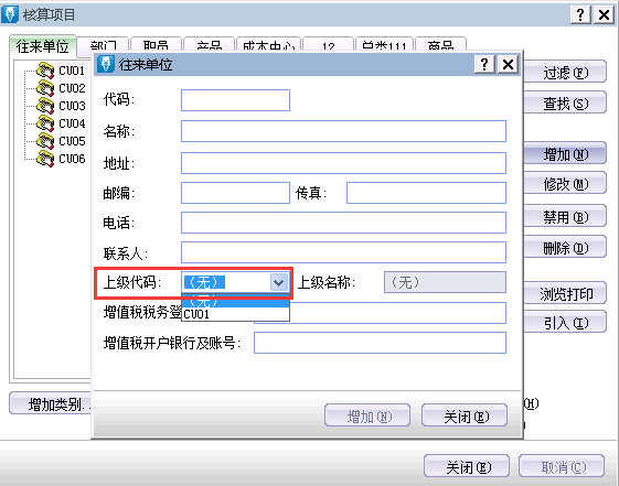 新增核算项目时,将对应的上级代码选为无之后进行保存即可。