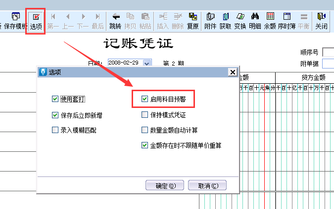 1、凭证录入页面点击[选项]-勾选[启用科目预警]参数;