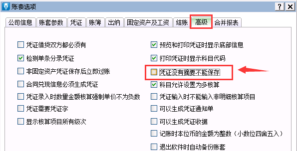 单击[系统维护]-[账套选项]-[高级]-[凭证],取消勾选“凭证没有摘要不能保存”。