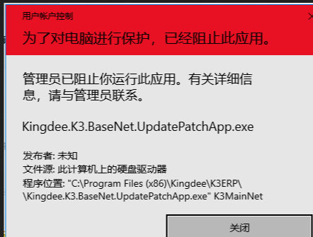 这两天很多客户的win10和win11电脑打开K3 WISE出现提示,为了对电脑进行保护,已经组织此应用。如图所示。