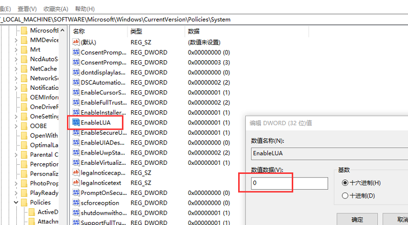 2、打开注册表,计算机\HKEY_LOCAL_MACHINE\SOFTWARE\Microsoft\Windows\CurrentVersion\Policies\System\EnableLUA。将该值修改为0。