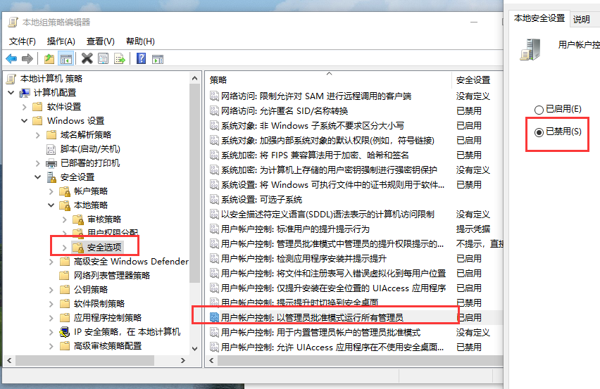 2、打开本地组策略,然后“用户帐户控制:以管理员批准模式运行所有管理员“禁用”。